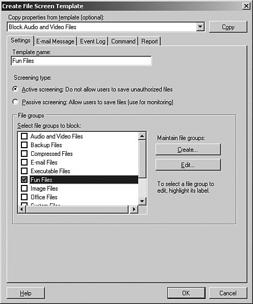 Figure 13.28. Select the file group to use, or click the Create button to make a new one.  | 4. | Enter the name of the template, and then select the file group we created in Step by Step 13.11. Make sure that the Active Screening option button is selected.