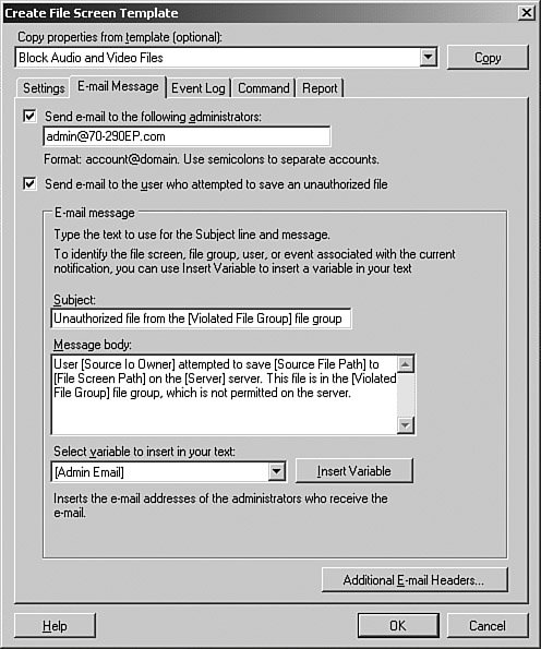 | | | 5. | Click the E-Mail Message tab. Select the options to send an email to both the administrators and the user, as shown in Figure 13.29.