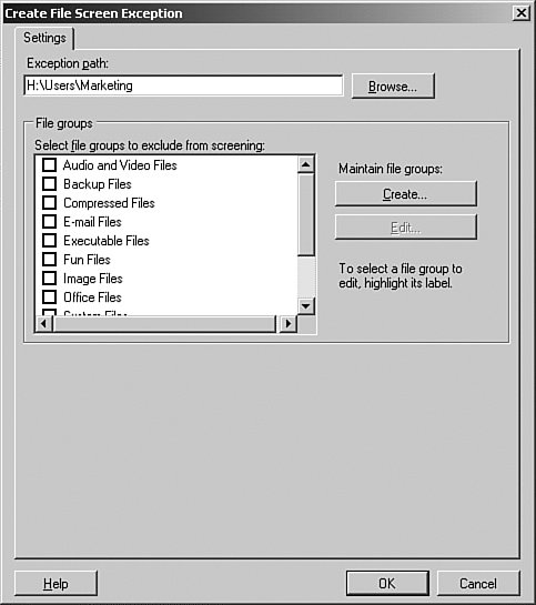 | | File Screen Exceptions Like everything else, the one-size-fits-all analogy doesn't always work for file screening. For example, what if the marketing department has a specific need to store video files, possibly out-takes for a commercial they are producing? Because you've already blocked *.mpg files, how are they going to be able to store their files on the servers? When there is a need to allow files that other file screens are blocking, you need to create a file screen exception. A file screen exception is a file screen that is used to override the screening for a folder and its subfolders. This is done by attaching a file group to the screen, just as we have done with regular file screens. Note: No Exceptions You cannot apply a file screen exception on a folder that you have already applied a file screen to. The exception must either be assigned to a subfolder or the original file screen must be changed. In Step by Step 13.14, we will set up a file screen exception on the root of the user's home folders to allow the saving of *.mpg files in the Marketing folder. Step by Step 13.14 Creating a file screen exception 1. | From the Start menu, click Start, Control Panel, Administrative Tools, File Server Resource Manager.