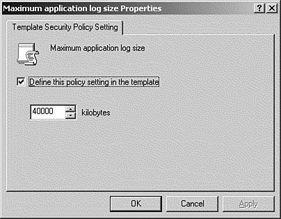 Figure 16.25. Using the Security Templates MMC to change the default value for the Application log.  | 11. | If this is the first setting that relates to this particular category, you might get an additional prompt to adjust the values of related settings. If so, accept the required adjustments (you can always change them later), and then click OK to continue.