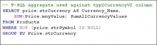 | The next challenge you might choose to scale is building CLR aggregates. These are a requirement if you expect to get meaningful aggregated information from a column declared with a UDTespecially with a UDT such as the international currency typICurrency I've been discussing. Sure, you can still use the built-in T-SQL aggregators (like SUM, MIN, MAX, etc.), but when used against a column whose value is not really stored in the same terms as other values in the same column, the results won't be of much use. For example (as shown in Figure 13.92), you can execute a T-SQL SUM against the Products table in my UDTCurrency database. However, in this case, the sum aggregates U.S. and Australian dollars, yen, British pounds, and euro values without regard to their currency. Most banks outside of Texas don't use this kind of math. Figure 13.92. Using a T-SQL aggregate against a CLR UDT column.  To solve this problem and any problem that requires a custom aggregate function (whether or not it's used against a UDT, you'll have to write your own custom CLR aggregate function. Again, this can seem like a very big challenge at first, as there seem to be a lot of details to worry about. Relax; I've blazed a pretty clear trail (which mostly involved figuring out how to actually implement the CLR aggregate, given the state of the Microsoft documentation and examples). Unlike a UDT, coding, building, deploying, and debugging a CLR aggregate is really pretty easythat's because Visual Studio can correctly tear down and use T-SQL ALTER to replace an existing CLR aggregate. This means you'll be able to set up a test.sql script in Visual Studio and simply click F5 when you need to build, deploy, and walk though the codeeach time you need to test it. What Is an Aggregate? An aggregate is a block of code designed to "aggregate", accumulate, or total values presented to it. It can also be used to perform set[22] functions on the values supplied. For example, an aggregator can find the maximum value of a set of numbers or the minimum length of a set of strings. [22] Set as in set arithmetic or set logic. An accumulator can also format values and return a concatenated result in any format you choose. A CLR aggregate can perform any operation you choose on a given set of values. This means your "SUM" can include or exclude any values you choose. Yes, this smacks of the accounting done at Enron, but I doubt they used a CLR to do the work. Perhaps, they would not have been caught if they had. When writing your CLR accumulator, you define the input and output data typewhich can be different. In the case of the accumulator, I also define (and coerce) the Precision and Scale to ensure that the data is correctly formatted when sent back to SQL Server. SQL Server (and T-SQL) does the work of picking off the values to aggregate and calls the Accumulate function to pass values to be aggregated, the Merge function to combine previously constructed "sub-totals", and the Terminate function to return the final result. It's the Terminate function that determines the datatype of the value ultimately returned by the aggregate. I'll focus quite a bit on this function. Walking Through the CLR Aggregate Example The example aggregate illustrated here is designed to total the mnyValue property values from a column defined with the CLR UDT typICurrencyV2. Before adding any non-U.S. currency to the total, the aggregator code converts the value to U.S. dollars. No, I'm not suggesting that the approach used here is a best practice. For one thing, it depends on fixed conversion rates, which would be suitable for ratios or conversion factors that don't change at all, but for international currency, exchange rates vary quite a bit over time. Perhaps a better example might be a UDT that aggregates temperature values in Fahrenheit, Celsius, and Kelvin and returns the values in a common scale. I also tried to read the conversion rates from a rates table stored in the database. The problem with this approach is that a CLR aggregate cannot access the local context connection. Yes, it would be possible to open a "normal" shared memory provider ADO.NET connection, but that would significantly impact performance. However, it might be a viable option for some situations where you really can't make do with a CLR Function. The MSDN documentation (available online or via Visual Studio help) is pretty good for aggregates. It is missing a few (too many, I think) key points that are emphasized here to keep you on track. However, I do recommend that you use the help topics for more in-depth information on attributes. A CLR aggregate has a unique configuration of functions and attributes that makes it quite different in a few respects from a CLR function or stored procedure. These CLR aggregate entry points (as described below) are called by SQL Server to initialize, add selected values to your in-memory accumulator, and retrieve the final sum. Let's take a high-level look at the code before venturing into the aggregator's back alleys and underground passages. Figure 13.93 shows the completed CLR SUMUSD aggregate program collapsed to the routine level. Figure 13.93. The Visual Studio CLR Accumulator application. Note that there are several routines each CLR aggregate must support and a few others that you might need to add: The Function attributes: These attributes, shown in Figure 13.93, define how the aggregate is seen by Visual Studio and built on SQL Serverat least, to an extent[23]. Here is where you indicate whether or not you want SQL Server to serialize the data values passed to and from the aggregate, the maximum size, and several other attributes settings that are well documented in the MSDN documentation. Because I'm working with the SqlDecimal datatype, I must provide my own serialization. As you'll see, this is not at all hard, as I'm serializing only one value. The function prototype does not set any of these attributes and defaults to Native s