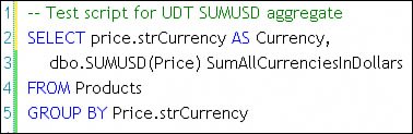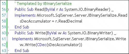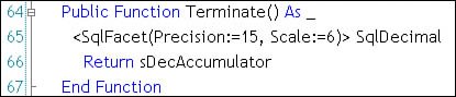 The Init Sub: This subroutine (prototyped by the Visual Studio CLR aggregate template) is coded to initialize the accumulator state. It's called once when the aggregate is first invoked. For this example, the internal state includes the local accumulatorthe value used to keep a running total of values declared as SqlBinary. Note that I set the Precision and Scale of the private variable sDecAccumulator (line 27). No, this might not be necessary in all cases, but I wanted some control over the way the decimal values were being kept in memory. I chose to use SqlDecimal to give me more control over the specific Precision and Scale value returned from the accumulator. Next, I populated the list of conversion rates. I already discussed how it might be necessary to populate this table dynamically. The completed Init routine is shown in Figure 13.94. The AddRate function is home-grownit simply populates a collection of currency types and rates. Figure 13.94. The CLR aggregate Init function. The Accumulate Subroutine: This routine, shown in Figure 13.95 (prototyped by the Visual Studio CLR aggregate template), is used to accept a typed value and "add" it to the set of values being accumulated. This might mean concatenating the value to a string, adding it to a collection of values to be summarized later, or anything else you can imagine. This routine is called each time SQL Server finds another value to include in the accumulator value set. Figure 13.95. The Accumulate function used to gather values. For this example, the CLR aggregate is designed to accept a (non-NULL) value typed with the CLR UDT typICurrencyV2. The routine tests the currency "type" (USD, AUD, GBP, etc.), and if it's not U.S. dollars ("USD"), it converts the value to U.S. dollars and adds it to the local accumulator (sDecAccumulator) used to keep a running totalU.S. dollar values are simply added to the total without conversion. Note that I make sure the converted value remains cast to the correct Precision and Scale (15,6) by using the ConvertToPrecScale SqlType method. The hand-made ConvertToDollars support function, shown in Figure 13.96, uses the conversion rate tables to figure the exchange rate value. Note that I also illustrate a couple of techniques to force the correct Precision and Scale. On line 92, I add a SqlFacet attribute to the Function. This gives the developer a way to specifically define how the return value is to be formatted. In this case, I set the SqlDecimal Precision and Scale. On line 97, I force the result to conform to this same (limited) precision and scale. Without these restrictions, the default behavior explodes the scale with more "accuracy" than makes sense (even to a mathematician). Figure 13.96. The custom ConvertToDollars function. The Merge subroutine: When SQL Server has to build totals and sub-totals from accumulated values, it calls the CLR accumulator's Merge routine to add these intermediate values to the set of values being accumulated. The routine (prototyped by the Visual Studio CLR aggregate template) is very simple in this caseI simply add the value to the local accumulator. Figure 13.97. The Merge routine is used to combine intermediate results. The Terminate function: The Terminate function (prototyped by the Visual Studio CLR aggregate template) is designed to summarize the set of values passed one by one to the accumulator and return that value back to SQL Server. This might mean computing the minimum, maximum, average, or other statistical summary value from the set of values. In this example, I simply pass back the current value of the accumulator used to hold the sum of the values presented. An important point to note here: By default, if you build a CLR aggregate, Visual Studio deploys the CLR aggregate using default numeric or string values. For example, if you simply declare that the UDT is to return a SqlDecimal without forcing the Precision and Scale, Visual Studio generates a RETURNS[numeric](18,0) clause in the CREATE AGGREGATE statement. This means that if you intend to pass back a floating point number or any number with a fractional component, all you'll get is the whole numberthe fraction is stripped. Strings are also formatted as NVARCHAR(4000), so you might also want to hard-cast the length of these return values. To make sure the entire value is sent to SQL Server, I force the Precision and Scale of the return value passed back from this routine using the obscure (but very handy) SqlFacet attribute, as shown in Figure 13.98. This "As" syntax that references the SqlFacet attribute is not documented in MSDN helpit was shown to me when I had trouble finding out how to force the compiler to set these datatype attributes. Figure 13.98. The Terminate function illustrating use of SqlFacet.  If you want to verify what type and precision is being used to handle your CLR aggregate, script the deployed aggregate using SQL Server Management Studio, as shown in Figure 13.99. Figure 13.99. Scripting the deployed aggregate in SQL Server Management Studio. The Serializer and Deserializer: Because I'm not using one of the simpler types, SQL Server requires that I add my own serialization code. Since I don't have to worry about formatting or reformatting the values, my Read and Write routines are brutally simple, as shown in Figure 13.100. Figure 13.100. The Read and Write routines serialize and deserialize the CLR aggregate value.  Testing the CLR Aggregate[24][24] The complete example is available on the DVD. See prjAggregateSumUSD. The bulk of the work required to set up a test scenario has already been doneI did it when I built the test scripts for the CLR UDT typICurrencyV2. When I'm ready to test, I set up a simple test script. Yes, I was able to use the test.sql script sample generated by Visual Studio as a starting point. Our test script (shown in Figure 13.101) expanded on that quite a bit. I suggest using small amounts of test data that include values at each end of t