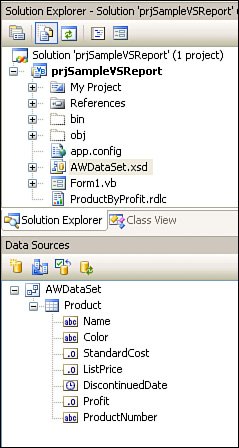 Figure 14.8. The Solution's Project Explorer showing the new Data Source.  | Laying Out the Report I'm now ready to lay out the report and program the RDLC. No, that does not mean you need to learn XML and RDL so that you can enter the arguments directly, unless you really want to. This process is very much like any other report or RAD development tool you've ever used, but it's generally easierthere are far fewer "controls" to choose from. | | 1. | Click on the ProductByProfit.rdlc report work surface and lay out the report elements. I'll need a TextBox and a Table report item. Double-click or drag-and-drop these items from the Report Items toolbox (as shown in Figure 14.9) to the report design surface.