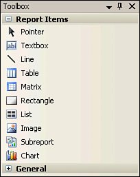 Figure 14.9. The Report Items toolbox.  | 2. | Align the TextBox and Table items as shown in Figure 14.10.