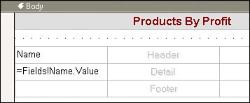 Figure 14.13. The report layout after all columns are placed into the Table item. | 10. | Yes, you can embellish the column formatting at this point. You'll probably want to set the formatting for the Profit value cell to "C", center the column headings, or perhaps decorate the header row fonts. Of course, this assumes that the report will always run on a computer where the installed regional currency is the same or where you've set the appropriate language properties of the report item. If this is not the case, you need to set the language property of the report TextBox item. To do so, select the cell or entire row and navigate to the properties page or one of the report-formatting toolbars and select the appropriate options.