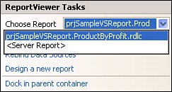 When you first access the ReportViewer control, the ReportViewer Tasks pane is opened. This gives you an opportunity to choose the report the ReportViewer control is to host. For this example, I'll simply point to the prjSampleVSReport.ProductsByProfit.rdlc RDLC report I already added to the project. As I discuss later in this chapter, you can also use the ReportViewer to address "server" reportsthose hosted on a Reporting Services 2005 SQL Server.