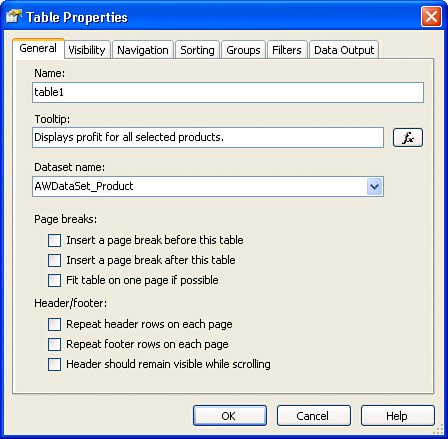 | | | 3. | Click-select the Table report item and right-click to open the Table Properties dialog, shown in Figure 14.18. Note that I've also filled in the Tooltip property. This and the other Table properties can also be set via the traditional Visual Studio Property page, but this dialog makes setting the Table report item properties easier.