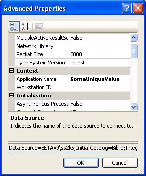| | | 2. | Click the "Advanced" button. This opens the Advanced Properties dialog, shown in Figure III.1. Scroll to the Context section and set the Application Name (or Workstation ID) property to a unique value. The default value for Application Name is set by Visual Studio to ".Net SqlClient Data Provider" so this same Application Name is used by every other Visual Studio application using a Data Connection to access SQL Serverthat's why you need to make the Application Name key unique, so you can pick out your traffic from the cacophony of commands being monitored.