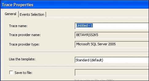 | 3. | This opens the Trace Properties dialog, shown in Figure III.2. If you accept the default properties, you'll probably get the unfettered stream of commands I've been talking about, so let's set the needed filters to make sure you see only pertinent events. Click on the "Events Selection" tab.
