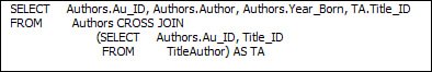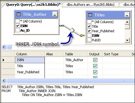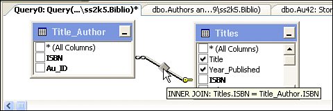 | One of the issues I've had with earlier versions of Visual Studio is the inability to create SQL queries to incorporate the T-SQL in an ad hoc query or to simply query the database to sample the data or test performance. While Microsoft has incorporated the Query Designer in a number of earlier versions (clear back to earlier versions of Visual Basic), it was not always easy to find. In Visual Studio 2005, the Query Designer can be addressed from a number of places. You'll be able to get to it when customizing a Visual Studio Data Source, creating the SQL for a stored procedure, creating a "DataSet" for a BI report, and here in the Server Explorer. IMHO Yes, the Query Designer used to be called the Query Builder. Tomorrow, there's no way to predict what it will be called. I expect that you might be familiar with the Query Designer by now, and I don't want to kill any more trees than absolutely necessary as I teach you how to use it. However, I do want to discuss a few new features that you'll find useful and a few other (sinister) issues[11] that might bite you in the butt as you walk by. Let's walk through a number of typical scenarios. [11] One of these issues was pointed out to Peter as he worked on a Reporting Services dataset. His wife saw a mistake as she passed by (vacuuming the room). Getting Familiar with the Query Designer Navigate to the Server Explorer, right-click the Table (or View) icon, and choose "New Query". This opens a four-pane tabbed window (see Figure 4.57) and a dialog that asks which tables should be included in the query. Figure 4.57. Setting up the Query Designer. Here's your first trick: If you want to create a query window and don't really care about the graphical part, click "Close" on the Add Table dialog without selecting any tables. This opens a blank "diagram" (top) window (what I call the table column selector). Use the pane selectors to turn off all of the windows except the SQL and query results windows. At this point, you can enter a query in the SQL window, and while the Query Designer might complain that it can't create a graphical representation of your query, clicking OK executes the query anyway and returns the rows affected or rowset in the query results window. The Query Designer Panes Note that the four panes can be toggled on and off with the pane selectors, the Query Designer menu, or keyboard shortcuts. As you modify each pane, the Query Designer attempts to build a SQL query and change the other panes to match these changes. For example, as you select columns in a table column selector (the top pane that Microsoft calls the "Diagram" pane), the SELECT statement is coded to include these columns and the "criteria" pane (the second pane from the top) reflects these changes as well. The columns are placed in the SELECT clause and the "criteria" pane based on the order in which they are checked off in the column selector. If you choose more than one table to include in the query in the "Diagram" pane (from the Table selector), the Query Designer creates appropriate (and sometimes inappropriate) JOIN syntax to return the SQL product. This is the issue that Peter's wife pointed out. Because the Query Designer creates one or more JOIN statements for each possible relationship, if you aren't careful, it can get a bit too aggressive and create JOIN statements that don't really make sense. The Criteria Pane The "criteria" (second) pane also determines which columns are included and aliased, and which order they appear in the SELECT. This pane also permits you to set the ORDER BY clause as well as the WHERE clause criteriaup to a point. To change the order in which rows are returned, set the "Sort Type" for the column(s) that you wish to sort by. You can change the sequence of this sort by setting the Sort Order. For example, you can sort on Year_Born and then by Author name. The Filter criteria column is used to generate the WHERE clause criteria. This permits you to specify criteria that must be met for each column for which you need to test. For example, you can set the Filter on the Year_Born column to accept only authors born in1947 (a good year for authors). The Filter criteria also includes several "Or" columns that can be used to add filters to your WHERE clause. These settings are shown in Figure 4.58. Figure 4.58. Configuring the WHERE and ORDER BY clauses with Sort and Filter.  Eventually, you'll discover that the Query Designer has indeterminate limits, so as your query gains in complexity, you'll find that the generated SQL stops working as expected. The SQL Pane The "SQL" query pane (third from the top) shows the generated SQL. The SQL dialect used matches that of the selected data provider. Yes, you can directly edit the generated SQL, but if you make a mistake (or the Query Designer simply can't understand the SQL), the Query Designer returns an error. I often find it handy to copy and paste from the SQL pane when I need to build a SQL string to paste directly into a prototype query in our code. The query results pane (bottom pane) shows the results of the query after you click the "Execute Query" button (see Figure 4.59). This pane also permits you to change the database table in question if the query addresses a single table. Figure 4.59. The Query Designer toolbar.  You can also validate your hand-coded SQL by clicking the Test SQL Syntax button. You can also incorporate a GROUP BY clause or a derived table in the T-SQL by clicking the appropriate buttons in the Query Designer toolbar. What's a "Derived" Table? One of the other options in the Query Designer toolbar is "Add Derived Table". Simply put, a "derived" table is not unlike what I call a "subquery". It's a SELECT statement that returns an in-memory rowset referenced as a database table or VIEW in a query. Derived tables are saved (only) in memory and not persisted to the database. Think of a derived table as a temporary rowset that lives for the duration of the query. Th