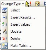 Figure 4.67. Insert Results Query type. In the example in Figure 4.70, I join three tables (Authors, Title_Author, and Titles) and return columns from Authors and Titles. I added a filter on Year_Published in the Filter pane to restrict the rows returned to just authors whose books were published in 1995. In a practical sense, this Filter value should probably be handled as a query parameter. When the Insert Results query is executed, Visual Studio returns a "rows affected" message.