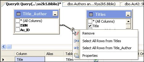 Figure 4.63. The Query Designer showing how the JOIN is configured.  | | | 2. | Next, right-click the join graphic. This opens a selection dialog that lets you choose the type of JOIN to generate, as shown in Figure 4.64.