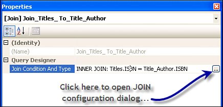 | | | 3. | Choose "Properties" from the JOIN-type dialog (shown in Figure 4.64). This opens the Visual Studio properties page for the Query Designer Join Condition and Type, as shown in Figure 4.65.