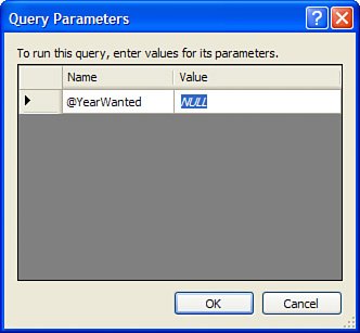 Figure 4.68. Using an input parameter in an Insert Results query. Now, when the query is executed, Visual Studio prompts us for the input parameter, as shown in Figure 4.69. Visual Studio remembers the value you used from the previous execution but defaults to NULL. You might want to phrase your query to "ignore" the input parameter if the value passed in the parameter is NULL or some special string.