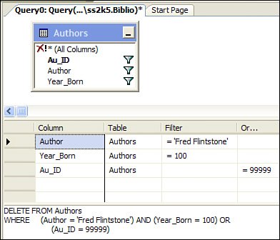 In this case, I'm updating any row with the author name (Author) of "Fred Flintstone" and Year_Born = 100 or with a PK (Au_ID) of 99999. Note that when you enter more than one value in the Filter column, the SQL logic uses "AND" to combine the logic. If you want an alternative (OR) Filter, enter the value in one of the Or... columns. Check out the SQL in Figure 4.71. Note how the WHERE clause is constructed using the Filter expressions and how the AND and OR clauses are generated.