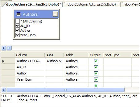 | 5. | Add whatever TOP or other expressions to the SELECT statement to further restrict the number of rows returned or to expose the rowset in a special wayunique to this view. In the example in Figure 4.73, I set the collating sequence to return a case-sensitive view of the author's table. This means when I SELECT against this view, I can differentiate between "MacDonald" and "MACDonald"if ever that becomes an issue.