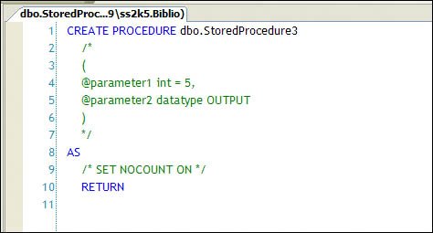 | 3. | Directly below the CREATE PROCEDURE command, you'll find a begin comment "/*" tag (Figure 5.2, line 2). This is placed in the template to comment out the parameters block. Since my procedure needs a few parameters (as most stored procedures do), remove the beginning "/*" (line 2) and ending "*/" (line 7) comment tags. Note that T-SQL comments are colored green so when you remove the comment tags, the text color changes to black and blue. Blue text terms are reserved words recognized by the T-SQL editor. As you edit the text in the T-SQL editor, Visual Studio color-codes comments, keywords, operators, and logic differently to help make it easier to know if the code is correctly entered. No, there is no intellisense when coding stored proceduresI've asked for this feature for decades without much progress.