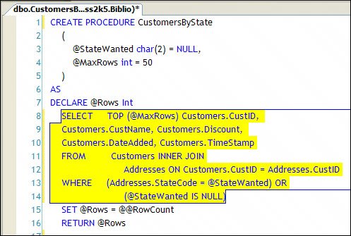[2] The sample Biblio database already has a "CustomerByState" stored procedure, so you might want to name your new stored procedure "CustomerByStateNew" or some such. Don't prefix your stored procedure name with "sp_".