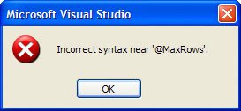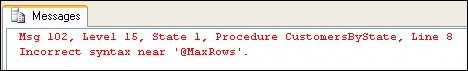 IMHO For some reason, the Visual Studio T-SQL editor insists on removing unnecessary (or, at least, what it judges to be unnecessary) carriage-returns (CR) in the T-SQL text. The T-SQL compiler does not care about these, and I often insert extra CRs into the T-SQL to make it easier to read (I did so in Figure 5.4). I think it's rude that the editor makes these arbitrary and unnecessary edits. At this point, your stored procedure should be ready to save. Here is where the "fun" part starts. Most of us are accustomed to interactive code development IDEs that make it clear where I've made mistakes in syntax or usage. The SQL editor in Visual Studio is not one of those developer-friendly tools. If there's something wrong, the IDE returns a very terse error dialogalmost akin to "Stuff happened". For example, if you remove the parenthesis around the "(@MaxRows)" expression and click the Save button (or File Save), you get back the dialog shown in Figure 5.5.