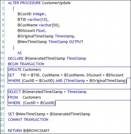 | | | 5. | The stored procedure has two T-SQL code blocksone to perform the UPDATE and a second to retrieve the newly generated TimeStamp value. These two operations are bound in a single transaction. Note that the UPDATE uses the Customer ID (CustID) to locate the row to change and uses the current TimeStamp value (fetched by the client application when the row was initially readbefore changes were made to the row) for concurrency. That is, if the original TimeStamp value matches the current (database) TimeStamp value, I know the row has not changed since last fetched, so it's safe to update. If the TimeStamp column has changed, I know some other operation has changed the row since it was last fetched. In this case, the UPDATE changes no rows. I inform the calling application of this by passing back 0 in the RETURN value and NULL in the @NewTimeStamp OUTPUT parameter.
