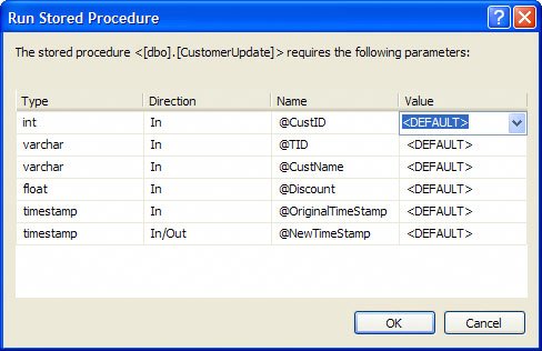 Wait a second. I was going to skip this, as I'm running out of time, but I can't go any further without showing you how to use the SQL Profiler to monitor what SQL Server is executing. This tool should be one of the first you pull out of your bag when you start testing stored procedures or any code generated by Visual Studio or ADO.NET. I've included a few pages in Appendix III, "Monitoring SQL Server," to show you how to set up a basic trace. I suggest you take a look before going on. | 6. | I'm ready to test this stored procedure, so navigate to the CustomerUpdate stored procedure in the Server Explorer and right-click. Choose "Execute". Since the stored procedure has parameters, Visual Studio displays the "Run Stored Procedure" dialog to capture the parameters (as shown in Figure 5.10). Note that all of the parameter are initially set to "<DEFAULT>".