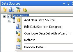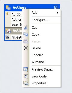 | | | 5. | Right-click on the Authors table in the DataSet designer (not on the Fill SQL). This opens yet another menu, as shown in Figure 6.17.