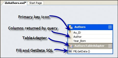Figure 6.16. The GUI DataSet designer showing the "dsAuthors" DataSet.  Upon closer inspection, you can see that the DataSet includes a primary key (the Au_ID column), it returns three columns (Au_ID, Author, and Year_Born), the TableAdapter is named "AuthorsTableAdapter", and both a Fill and a GetData fetch method have been created (by default) in the TableAdapter. No, you did not do anything when executing the DSCW to affect these settings other than choosing the Authors Table and selecting the columns to return. All of the rest were generated by default.