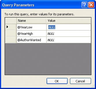 Figure 6.25. Capturing query parameters.  Notice that the parameters all default to NULL. Once you set a value, subsequent executions of the query using the Execute Query button default to the settings you supply on the previous run. Try various values in your querybe sure to enter values that don't make sense and see what happens. Make sure the rows returned make sense. Your UI code that captures parameters from the user (I'll get to that step later) must ensure that any parameters' values fall within acceptable range and conform to the correct typethe strongly typed code can go only so far.