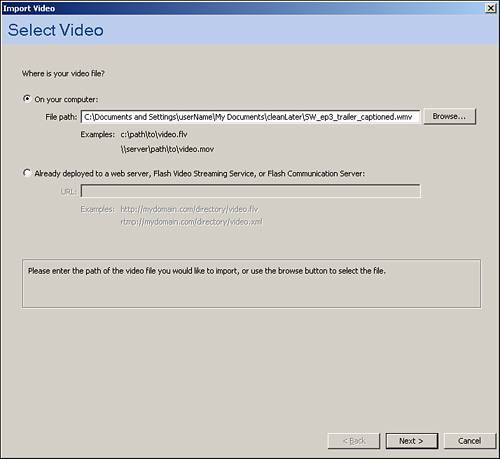 | 2. | When the Video Import Wizard pops up (see Figure 6.9), click Browse and choose any video you want (or use one from the companion site). Notice, however, that you can also map to videos that are out on the web.