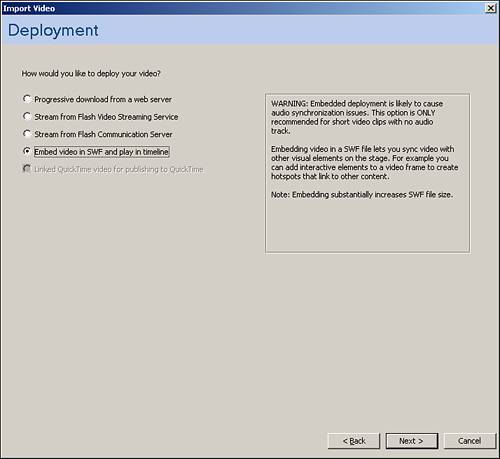 | 3. | Click Next and the next screen asks you how you want to deploy video (see Figure 6.10). For this chapter, choose Embed Video in SWF and Play in Timeline. Chapter 26 talks a bit more about having the video be external.