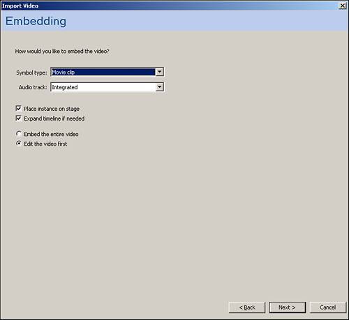 | 4. | The Embedding window (see Figure 6.11) enables you to choose different options for the symbol type. Set this to Movie Clip so it will work with a later example. You can also choose whether you want the audio either integrated into the video or as a separate file. And you can choose to place an instance of it on the stage and stretch the timeline. Finally, in this section, you can choose to edit your video before you import it, so choose that option and click Next.
