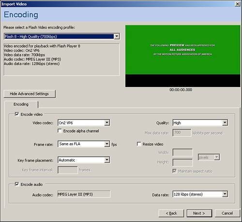| 6. | After you have made the slice you want, click Next to get to the Encoding section. This section enables you to select the type of encoding, including quality and player, because the Flash 8 player has a different video codec than the Flash 7 player. This means that if your intended audience has the Flash 7 player, and you choose the Flash 8 player, errors will occur, and users with the older player will not be able to view all your content. Also in this section are some more options. If you click the Show Advanced Settings button, you will see something similar to Figure 6.13. This is where you can set it to encode the alpha channel, so keep that in mind. Click Next when you have the settings you like.