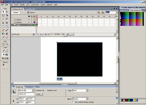 | 2. | Back on the stage, name the layer the video resides in video and add two more layers, actions and buttons.