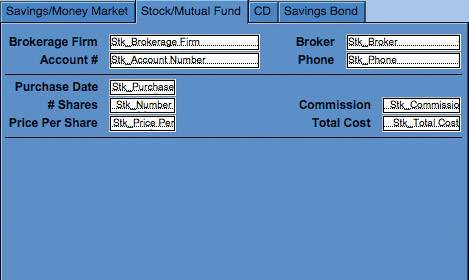 | Next, we'll place fields and labels on the Stock/Mutual Fund tab panel. Use the Text Tool to delete the Stk_ prefix from all the stock-related fields. In addition, change the field label for Stk_Account Number to Account #, Stk_Number of Shares to # Shares, Stk_Current Share Price to Current Price, and Stk_New Date to Price Date. Set the Stk_Brokerage Firm and Stk_Account Number fields to a width of 2.097". Set the Stk_Broker and Stk_Phone fields to a width of 1.597". Set the Stk_Purchase Date, Stk_Number of Shares, Stk_Price Per Share, Stk_Current Share Price, and Stk_New Date fields to a width of 0.931". Set the Stk_Commission and Stk_Total Cost fields to a width of 1.097". Click the Stock/Mutual fund tab to make it active. As shown on the next page, drag the following fields and labels into the next section of the tab: Stk_Purchase Date, Stk_Number of Shares, Stk_Price Per Share, Stk_Commission, and Stk_Total Cost. Select the line that's above the section, choose Edit > Copy ( / ), and then choose Edit > Paste ( / ) to create a duplicate of the line. Drag the duplicate line into position beneath the current section. Use the Size palette to ensure it is the same distance from the left edge as the original line. Here's the Stock/Mututal Fund tab panel with the first two sections completed.  Place the Stk_Current Share Price and Stk_New Date fields and labels in the next section, followed by another duplicate of the 1 pt. black divider line. Using the Size palette, ensure that the right edges of all labels in the same column align with one another, as well as the left edges of all fields in a column. Similarly, the tops of all labels and fields in a row should align with one another. |