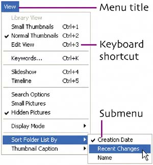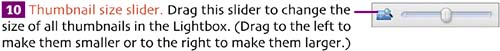 | Menus. Menus appear across the top of all Windows applications. To open a menu, click its title (such as File or View). Move the mouse down to the command you want to execute and click its name.  Some menu commands are followed by a triangle, indicating that the command has a submenu from which you must choose an option. To select such a command, move the mouse to highlight the primary command; the submenu pops out. Click the command in the submenu that you want to execute. A single key (such as F2) or a key combination (such as Ctrl+3) is listed to the right of some menu commands. These keys and combinations are referred to as keyboard shortcuts. By pressing the designated key(s), you can execute menu commands without having to open their menus. Lightbox tools. As a convenience, you can execute any of these commands by clicking a button, rather than having to find them in Picasa's menus.  Folder List. The Folder List shows the names of all folders on your hard disks in which Picasa has found picture files. Click a folder name in the list to display the images it contains. Folders in the list are grouped within collections (folder classifications that Picasa and you create). By clicking the button to the left of a collection name, you can hide or reveal the folders in the collection. To learn more about working with collections and folders, see Chapters 3 and 4. Search tool. By typing text into the Search tool's text box, you can search for matching image files and folders. Click the icon to the right of the text box to show or hide additional search options. For more information on searching, see Chapter 3. Lightbox. This refers to the right side of the Picture Library. All folders recorded by Picasa are displayed in a scrolling listthe Lightbox. The pictures in each folder are shown as miniatures called thumbnails. The effect is similar to that of a lightbox you'd use to examine photographic slides and negatives. Double-click any thumbnail to view a full-sized version of the image. If you want to perform the same operation (such as printing) for several photos, you can select multiple thumbnails. Selected photos are shown in the Picture Tray (7). Only one folder can be active. The active folder is shown as selected (highlighted in blue) in the Folder List, and its title bar in the Lightbox is the same color. To make a different folder active, click its name in the Folder List or click anywhere within the folder in the Lightbox. Actions button menu. Click the active folder's Actions button to reveal a menu of useful commands that are relevant to the folder or to thumbnails you've selected within the folder. Star and Rotate icons. Click the Star icon to add or remove a gold star from the selected thumbnails. (Starred images are special to you in some way.) Click a Rotate icon to rotate the selected image(s) clockwise or counterclockwise.  Output options. Click one of these icons to perform an output action on all images in the Picture Tray, such as printing, emailing, or exporting.  |