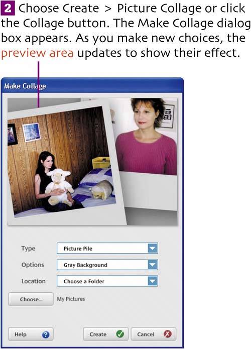 | Collage is one of Picasa's most interesting features. You can use it to combine multiple images into a picture pile (Polaroid-style photos) or a multiple exposure (one picture superimposed over another), for example. Picture Pile example  Select the pictures from which you want to create a collage, adding them to the Picture Tray.  Choose a collage style from the Type pop-up menu: Picture Pile, Picture Grid, Contact Sheet, or Multi-Exposure. Choose a background color or image from the Options pop-up menu. Optional: To specify where to store the resulting collage (different from the proposed location), choose a folder from the Location pop-up menu. To pick a folder other than those listed in the Location menu, choose Choose a Folder and then click the Choose button. Click Create. The collage is created and stored in the specified location on disk. |
