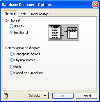 Under Symbol Set, select IDEF1X or Relational, and then specify the name options you want to display.