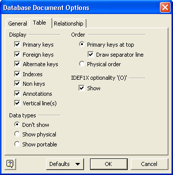 Click the Table tab, and then choose the attributes you want to have displayed in table shapes, primary key order, data type display, and whether to display IDEF1X optionality.