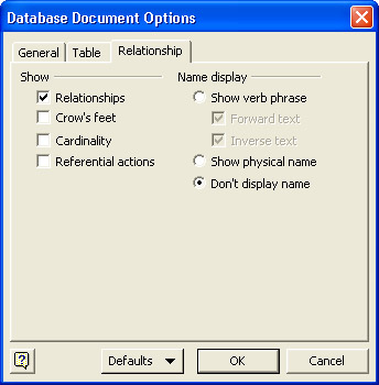 Click the Relationship tab, and then choose whether to display relationships. If you do, specify the relationship notation you want to use (such as Crow’s Feet), whether to display cardinality and referential integrity, and how to display the relationship verb phrase and name (role text).