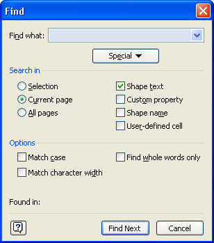 Finding and replacing text in a Visio diagram works a little differently from your typical word processing document. When Visio searches for text, it examines text in shapes, in text-only shapes, on stencils, in the Properties box, text within custom properties, shape names, user- defined cells (a type of ShapeSheet cell of interest to shape developers), and in data files. You can also search for special characters, such as tabs or line breaks.