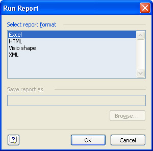 If you choose Microsoft Excel (File), HTML, or XML, specify a name for the report file that Visio creates in the folder you want. If you choose Microsoft Excel (Shape) or Visio Table Shape, choose whether to link shapes to the report definition or save a copy of it with the shapes.
