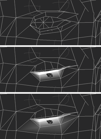 | 3. | Using a softer brush, paint in the area of the eyebrow. Make the vertices closest to the eyebrow almost fully affected by the joint; allow the influence to fade out as it moves away (Figure 13.20, middle).