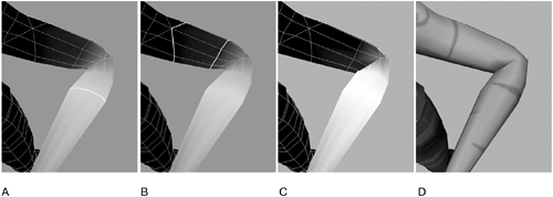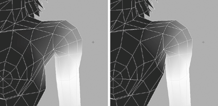 | 5. | Notice that the edge highlighted in Figure 14.10, middle, is the major cause of the crease: It is flipped the wrong way. Select this and delete it; then delete the same edge on the opposite shoulder.