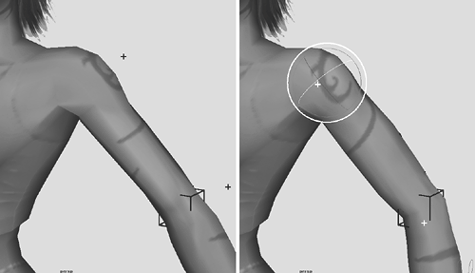 | Now the shoulder should look pretty good in the major poses. Before you move on to the elbow, rotate the shoulder around and double-check all the weighting. Elbows The elbow is slightly easier than the shoulder to weight because it only rotates around one axis. 1. | Raise the arm to make the elbow easier to edit. Then rotate the elbow joint around the Y axis (Figure 14.11).