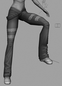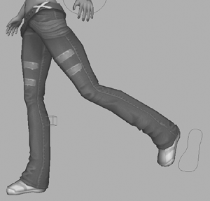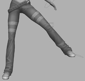 | As a final test, rotate the foot into a few different poses to see how the jeans deform. As you can see in Figure 14.29, the folds in the jeans compress nicely and work quite well, so there is no need to do any further work on this area. Figure 14.29. Test the lower leg's deformation in other poses.