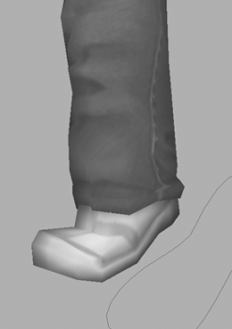 | Although things in this area may initially look all right, the main foot area's weights are distributed between three jointsthe ankle, toe, and tipmaking it flatten as the foot rotates. Let's fix this, weighting the main bulk of the foot to one joint, the ankle joint. 2. | Highlighting L_Ankle as the joint to edit, fully weight the heel of the shoe and the lower part of the jeans to this L_Ankle joint (Figure 14.28, right).