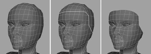 TIP The Isolate Select command is very useful. For example, you can isolate components such as a selection of faces rather than whole objects. | 7. | Continuing on, you need to extrude the lower edge at the temple (Figure 4.11, middle). This edge must be brought down to meet the bottom of her hair (Figure 4.11, right).