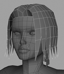 | When you're finished working on this side of the head, you can create a mirrored version to see how the hair is looking overall. Begin by selecting all the pieces of geometry that make up the hair on Kila's left side. Press Ctrl+G/Cmd+G to group them. Open up the Duplicate options, make sure that Instance is not selected, and click Duplicate or Apply to create a mirrored duplicate of the group (setting the Scale value for the X-axis to 1). Kila's coiffure should now resemble Figure 4.15. For now, the hair shape is acceptable. It still needs more work, but let's leave it for now and go on to create the left side of the hairdo (Kila's right). It will be different from the right side. Figure 4.15. Fill out the hair with additional pointy strips.