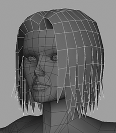 | Apart from some final tweaking, our outer layer is complete. It needs additional work, moving the vertices to randomize the shape, but we won't do that until all the basic geometry is in place. Now we must fill out the hair, making it appear thicker, giving it more volume. 3. | Using the strips on the inside layer, do as you did with the outer ones. Select the bottom edges and collapse them, then adjust the upper edges until you have long, sharp polygons.