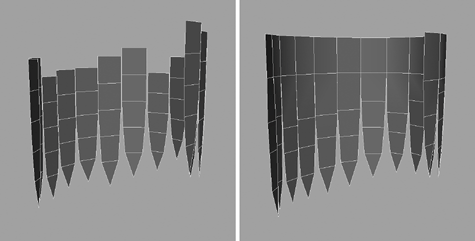| 6. | Scale the top row of vertices down the Y axis so that they all lie on the same level. Just using the basic Scale manipulator is sufficient here because you do not need to have an exact scale. Then weld them all together, making a complete strip running around the top. Do this again for the next row down. As needed, adjust the remaining strips to tidy up the rest of the geometry. Figure 4.20 (right) shows what you're aiming for.